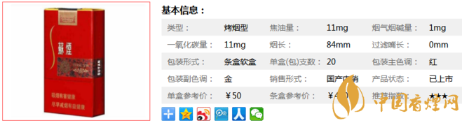 | 类型 :烤烟型 | 焦油量 :11mg | 烟气烟碱量 :1mg | 一氧化碳量 :11mg |