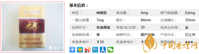 | 类型 :烤烟型 | 焦油量 :6mg | 烟气烟碱量 :0.6mg | 一氧化碳量 :7mg |