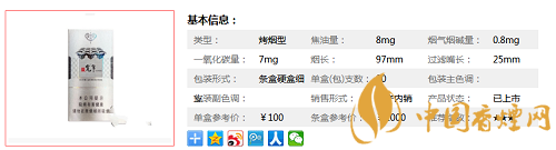 | 类型 :烤烟型 | 焦油量 :8mg | 烟气烟碱量 :0.8mg | 一氧化碳量 :7mg |