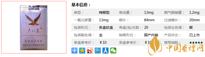 大红鹰软新品对产品的内在质量设计,总结多年来的产品开发经验,集成了整合后的技术研发优势对烟叶原料进行精心的筛选,反复配比,精心组合,优选了津巴布韦、加拿大等国际高品质的烟叶以及云南、河南、贵州等国内优质的烟叶进行搭配,提升了产品定位。下面我们一起来看大红鹰软新品的参数信息:焦油量:13mg 烟碱量:1.2mg 一氧化碳量:13mg。
