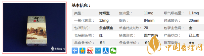 | 类型 :烤烟型 | 焦油量 :11mg | 烟气烟碱量 :1.1mg | 一氧化碳量 :12mg |