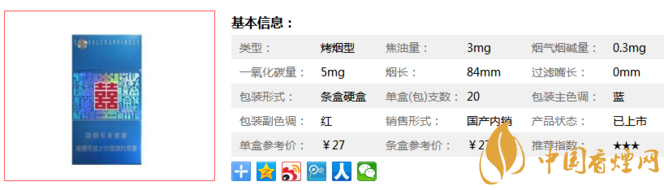 | 类型 :烤烟型 | 焦油量 :3mg | 烟气烟碱量 :0.3mg | 一氧化碳量 :5mg |