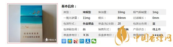| 类型 :烤烟型 | 焦油量 :10mg | 烟气烟碱量 :1mg | 一氧化碳量 :11mg |