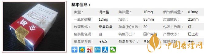 | 类型 :混合型 | 焦油量 :10mg | 烟气烟碱量 :0.9mg | 一氧化碳量 :12mg |