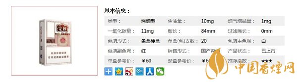 | 类型 :烤烟型 | 焦油量 :10mg | 烟气烟碱量 :1mg | 一氧化碳量 :11mg |
