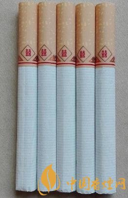 这烟的整体包装秉承了20世纪初双喜喜庆的风格,既有传统又有创新,主图案采用精细烫玫瑰金工艺,整体色彩低调而不失奢华,图案层次分明,立体感强,包装材料使用特种环保仿古纸,与图案设计风格协调、统一,具有浓厚的历史感,图案的整体布局简约清晰,朴实而不失喜庆,虽简单但很优雅。包装采用国际最新技术环保再生纸封装,应用食品级油墨印刷,环保由里到外贯穿始终。