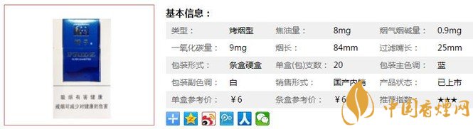 | 类型 :烤烟型 | 焦油量 :8mg | 烟气烟碱量 :0.9mg | 一氧化碳量 :9mg |