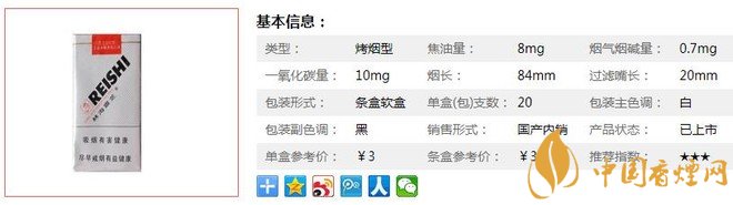 | 类型 :烤烟型 | 焦油量 :8mg | 烟气烟碱量 :0.7mg | 一氧化碳量 :10mg |