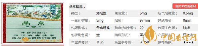 | 类型 :烤烟型 | 焦油量 :6mg | 烟气烟碱量 :0.6mg | 一氧化碳量 :5mg |