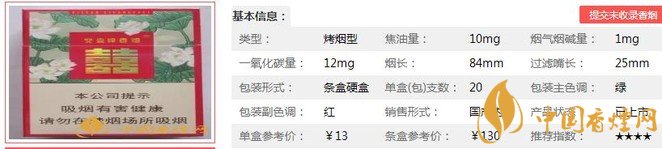 类型 :烤烟型 焦油量 :10mg 烟气烟碱量 :1mg 一氧化碳量 :12mg
