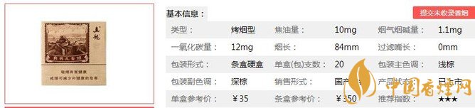 | 类型 :烤烟型 | 焦油量 :10mg | 烟气烟碱量 :1.1mg | 一氧化碳量 :12mg |