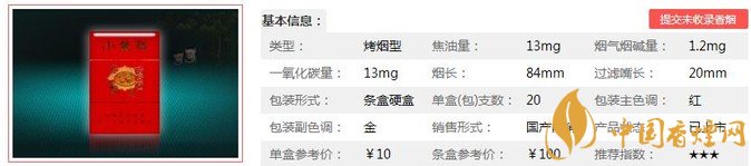 类型 :烤烟型 焦油量 :13mg 烟气烟碱量 :1.2mg 一氧化碳量 :13mg