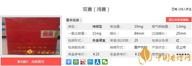 其所选用的烟叶全部来自于海拔1200米以上的山地生态烟叶,保证了原料上的优越性,配以广东中烟自主研发的三元复合滤嘴,起到了增香、保润、提纯的作用,使鸿喜产品的烟气柔和绵长,口感圆润生津,香气饱满透发,真正做到了刚柔并济。经jrs直播小编市场调查双喜鸿喜售价为25元/包。