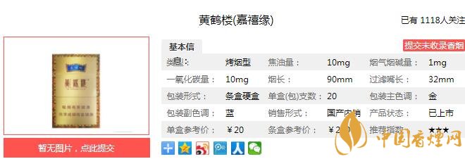 以环神农架地区优质原生态烟叶辅以天然香精香料,以现代工艺增香体质,让烟气醇和舒畅,香味优雅细腻,入喉细腻醇和,回味绵长。经jrs直播小编市场调查黄鹤楼嘉禧缘售价为20元/包。