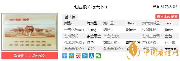 七匹狼行天下烟支长84mm,过滤嘴长34mm,卷纸采用横纹结构,以手捏之,柔软而充满弹性。以鼻嗅之,烟草本香气息不浓,夹杂着果木之香的气味,充斥着鼻翼。下面我们一起来看七匹狼行天下的参数信息:焦油量:10mg 烟碱量:1.0mg 一氧化碳量:11mg