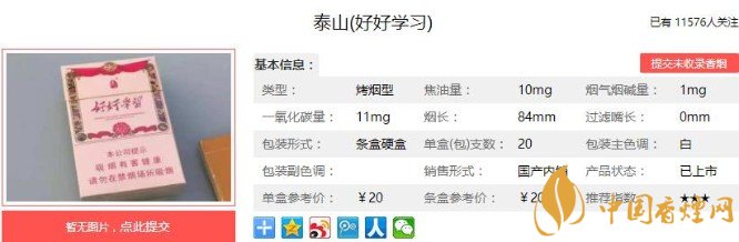 泰山香烟这两年来还是比较活跃的,推出了不少新品香烟,不管是味道还是品牌形象都是有提升很多的。但是好像没什么令人印象深刻的产品,这一款也算是其中比较能够打响品牌的香烟吧。泰山好好学习售价是在20元/包,总体来说性价比还是可以的。