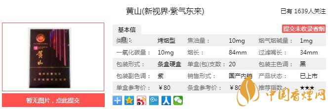 黄山新视界紫气东来烟支长84mm,过滤嘴长34mm,黄山新视界紫气东来烟支的设计与外包装采用相同的色调,油性水松纸,高贵而大气。下面我们一起来看黄山新视界紫气东来的参数信息:焦油量:10mg 烟碱量:1.0mg 一氧化碳量:10mg