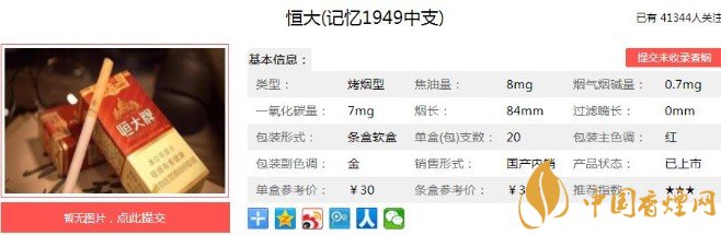 恒大(记忆1949)是中支规格的香烟,加上又是84mm规格,烟气偶有稀薄感,也可以理解。烟气的整体劲道,是中低浓烈度的范畴,理化指标的数值含量,也说明了这款香烟的具体情况。下面便是香烟的参数指标:焦油量:10mg烟碱量:0.9mg一氧化碳量:11mg.