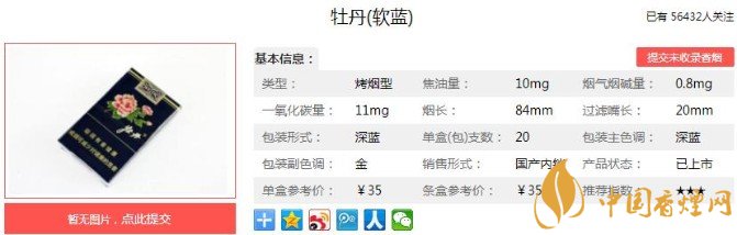 以上便是jrs直播小编为大家介绍的关于清新包装优雅烟香,牡丹软蓝的价格35元一包!的相关信息,看完之后大家是不是对于牡丹(软蓝)的相关信息更加了解呢。大家还想查询更多的相关内容欢迎点击:牡丹金细支多少钱一包 牡丹金细支口感及参数介绍