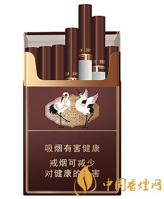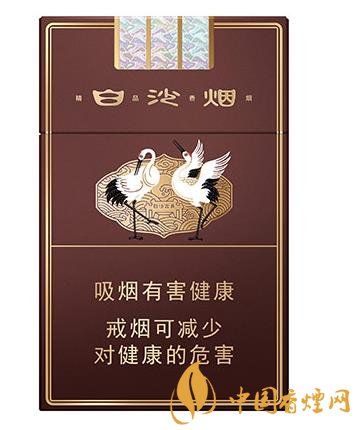 烟盒整体是朱褐色,四边有两条的细长的金边,翻盖处是“白沙烟”3个金色汉字,每个字中间间隔“精品香烟”4个字。中间是白沙香烟经典的白沙鹤舞图,两只白鹤闲庭信步,独立展翅,配上背景金色的波涛和白沙古井字样,整个场景颜色搭配巧妙,刻画细致,白鹤描绘传神,让人不由细细观赏。