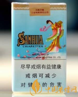 烟盒正面包装以蓝天白云为背景,从蓝天洒下朵朵红花,背面一位婀娜多姿的古代美女轻盈的站在白云之上,从花篮中洒下美丽的花朵,寓意着给民间带来风调雨顺,国泰民安,与正背面金色的散花汉字以及SANHUA汉语拼音共同构成了一幅美丽的赏心悦目的画面。