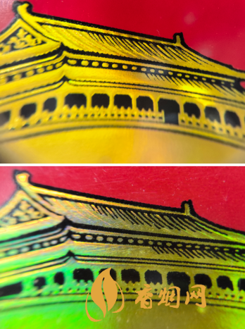 三、小盒正面印刷工艺对比: 真烟的天安门城楼印刷工艺精细,摸起来有明显的凹凸感,线条由粗到细,过渡自然;而假烟的天安门城楼印刷工艺较差,无明显触感,线条粗糙凌乱。