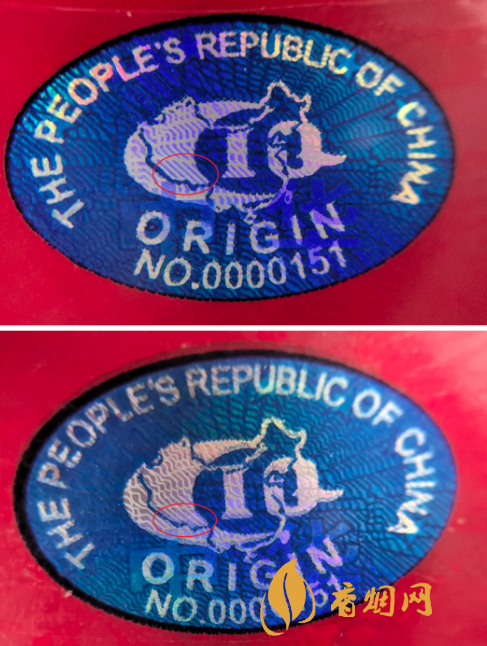 真烟的原产地标志为蓝色椭圆形,折光可见“中华”字样、8颗“★”及天安门图案,色彩饱满,图案清晰。而假烟色彩暗淡,图案模糊。