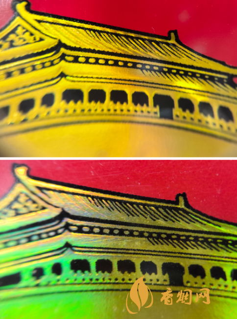 真品香烟:天安门城楼摸起来凹凸感明显,线条由粗到细。