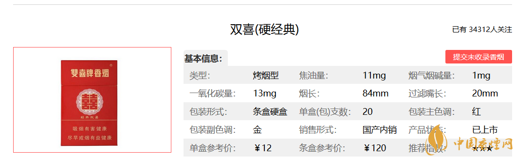 双喜硬经典,口感较浓厚,余味酸甜,烟劲适中,略刺喉,但是人为香精调香太多,烟草本香基本体会不到,烟味层次感欠佳。比软包经典醇香的香气味要浓厚,人工香气也比较大,但是在余味上与软包差别不大。在红双喜经典香烟价格表图中也是比较有特色的。