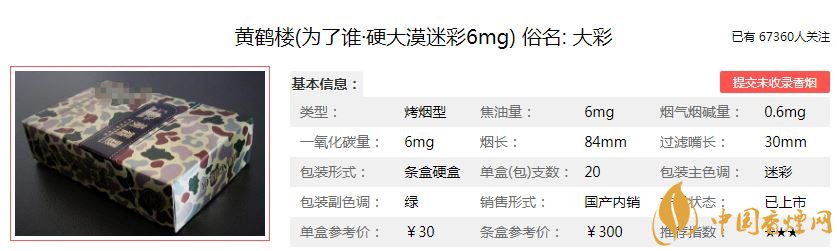 外观看起来很不错,军旅迷彩风,大气养眼。符合黄鹤楼绵软的特点,不过稍微有点辣喉,黄鹤楼大彩的焦油含量会更高一些,