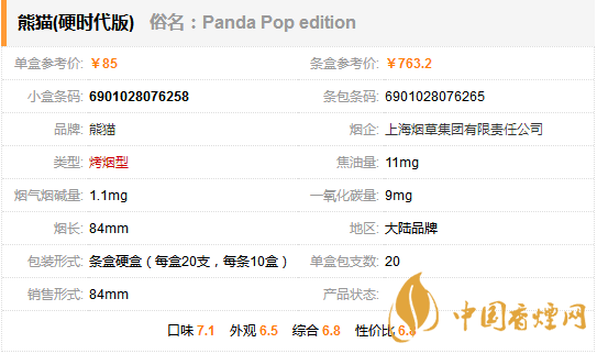 熊猫(硬时代版)烟(俗称:Panda Pop edition)是上海烟草集团有限责任公司旗下品牌熊猫香烟推出的一款焦油含量11mg的烤烟型香烟。下面小编就为大家讲解一下这款香烟的价格以及参数。