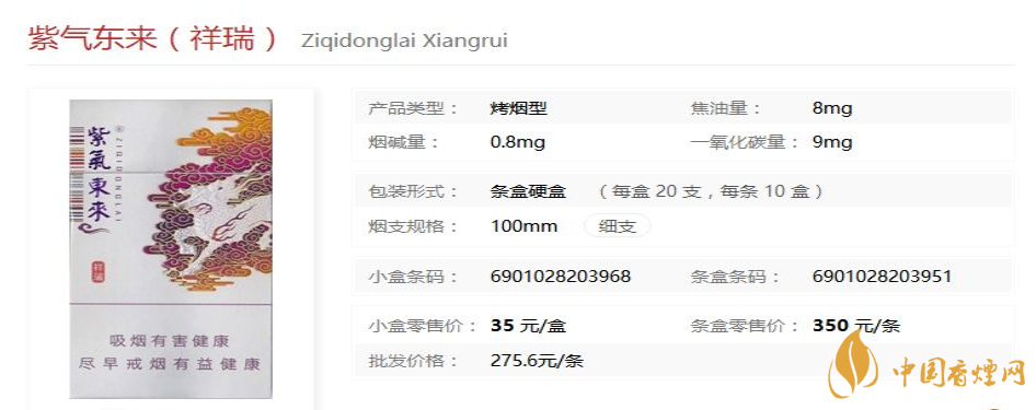 “紫气东来(祥瑞)”借助红云红河集团高端品牌研发技术优势,选取国外进口的优质原料和以醇化多年的云南优质烟叶为基础,并辅以植物王国多种天然香原料。针对细支烟不同的烟气递送规律,综合运用多级调香、多元补香的多维配方技术进行调配,既有效降低了烟气有害成分,又保持了较强的满足感。经市场调查紫气东来祥瑞售价为35元/包。