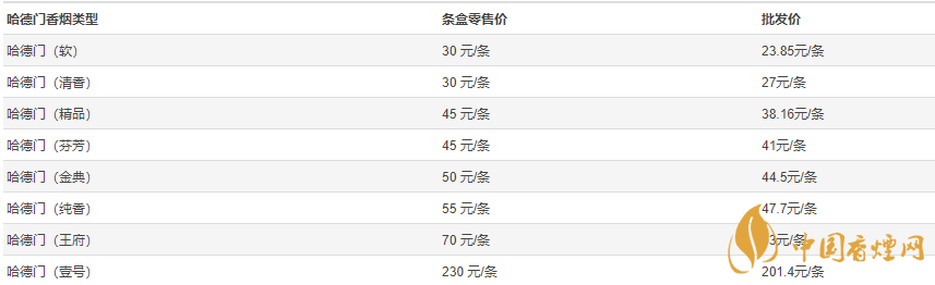 哈德门产品系列共有八种香烟产品,其中除了哈德门(壹号)每条零售价是230元之外,其他的七种香烟产品,条盒零售价基本都是在30至55元之间,由于每条10盒,所以,每小盒的价格即在3至5元左右。可见,哈德门香烟的价格是比较低廉的,也符合它“民品之名品”的称号。
