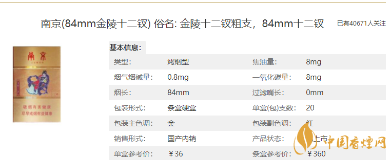 价格:28元/包,这款南京(金陵十二钗烤烟)是金色的包装,这也是销量最好的一款香烟,这款香烟是细支香烟,柔和但烟气饱满纯正,没有其他细支寡淡的感觉。6mg的焦油含量属于低焦香烟。