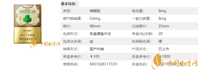 | 类型 :烤烟型 | 焦油量 :8mg | 烟气烟碱量 :0.8mg | 一氧化碳量 :8mg |