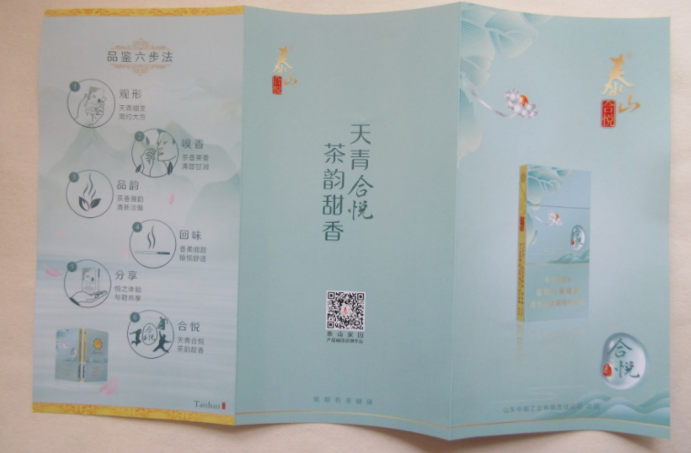 泰山(合悦)沿用天青色配色,图案设计继续沿用“悦”系列荷花形态。当然从包装材质和设计上,比泰山(心悦)、泰山(颜悦)更加美观大气。口感上主打茶韵甜香,官方宣传“烟香饱满,茶韵甜香”,“柔和圆润,入喉舒适”,“浅吸不淡,深吸不腻”,“清甜甘润,回味甜爽”。经过市场调查了解到泰山合悦香烟售价为26元/包。