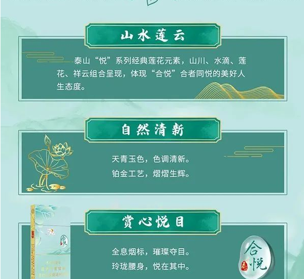 泰山(合悦)沿用天青色配色,图案设计继续沿用“悦”系列荷花形态。当然从包装材质和设计上,比泰山(心悦)、泰山(颜悦)更加美观大气。