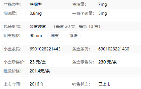 类型 :烤烟型 焦油量 :7mg 烟气烟碱量 :0.8mg 一氧化碳量 :5mg