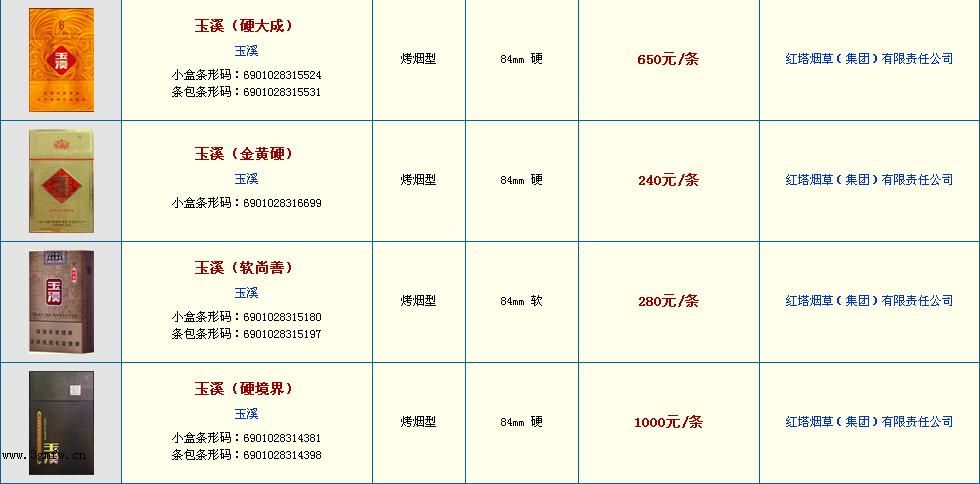 玉溪(硬大成) 玉溪 小盒条形码:6901028315524 条包条形码:6901028315531 烤烟型 84mm 硬 650元/条 红塔烟草(集团)有限责任公司