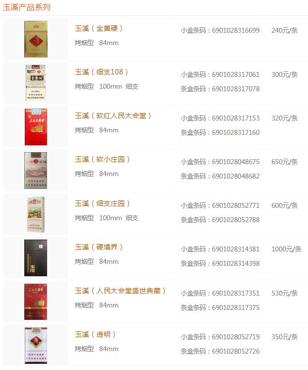 玉溪(8090) 玉溪 小盒条形码:6901028316606 条包条形码:6901028316569 烤烟型 84mm 硬 320元/条 红塔烟草(集团)有限责任公司