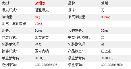 | 类型 :烤烟型 | 焦油量 :8mg | 烟气烟碱量 :0.9mg | 一氧化碳量 :10mg |
