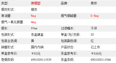 | 类型 :烤烟型 | 焦油量 :5mg | 烟气烟碱量 :0.5mg | 一氧化碳量 :4mg |