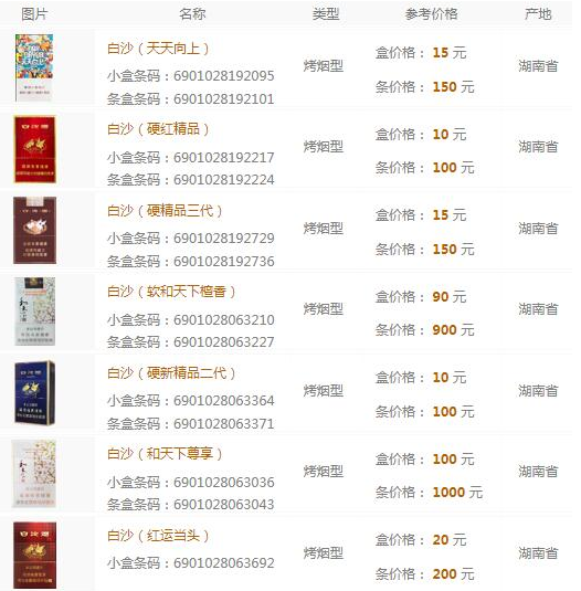 白沙香烟价格表和图片大全(29)种 白沙香烟多少钱一条