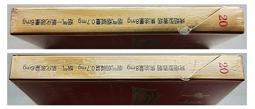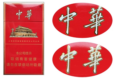 真品卷烟:华表柱中祥云、龙图案印刷清晰、色泽均匀一致;侧光观察华表柱图案印刷整体油润饱满、凸起;中华字母烫金完美。