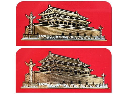 真品卷烟:天安门图案凹凸有致,线条套印准确,黑色线条清晰且颜色较重;金色亮泽度高,烫金线均匀一致。
