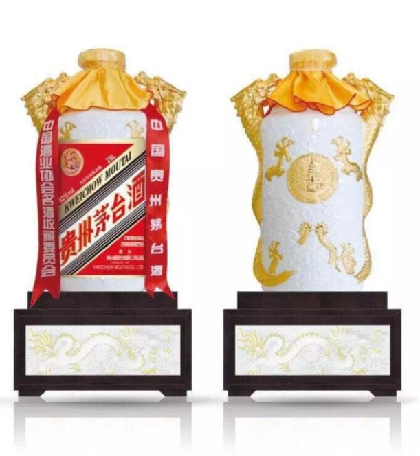 为纪念贵州茅台酒巴拿马万国博览会金奖100周年,特生产贵州茅台酒百年百斤双龙汇,瓶身两侧伴有双龙戏珠的立体雕塑,一方沉稳大气,一方英气逼人。寓意深刻,具有极高的收藏价值。