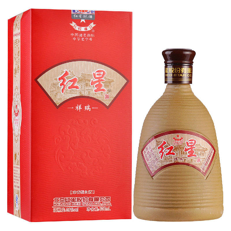 酒精度:39°规格:单瓶酒厂:北京红星股份有限公司品牌:红星香型:浓香型产地:北京箱规:1箱x6瓶净含量:500ml酿酒原料:水、高粱、小麦储藏条件:阴凉干燥处常温贮存2010年39度红星祥瑞500ml,由北京红星出品,的一款39°浓香型白酒,这款39度浓香型红星酒价格79元一瓶。