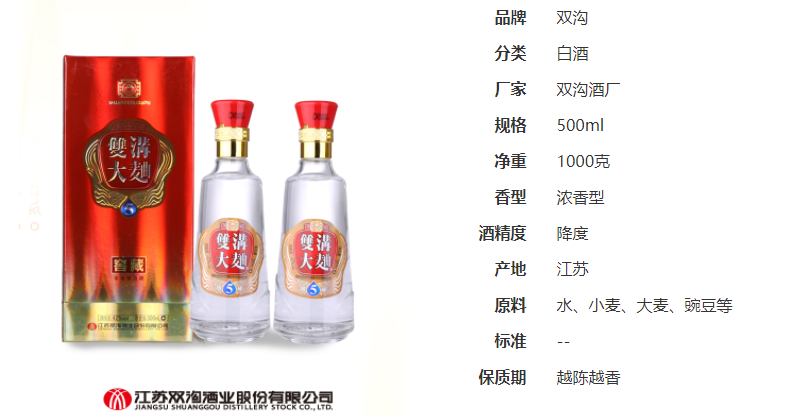 以上是小编整理的有关双沟大曲窖藏(5)42度价格多少和双沟大曲窖藏5多少钱的相关资料信息,希望能够对大家了解相关情况有所帮助,想获得更多消息资讯请关注jrs直播!