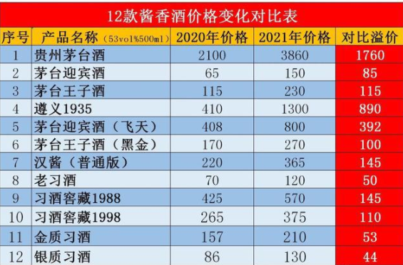那么,在诸多酱香酒产品中,谁的价格涨得最多?答案是,茅台集团的酱香酒产品涨价最多。下面这张表格就能看出茅台集团的酱香酒产品发挥了涨价先锋的模范带头作用。