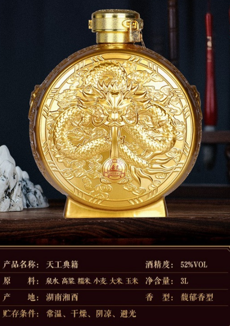 酒鬼.天宫典籍,酒鬼酒股份有限公司2021年推出的一款新品。瓶身由“画坛”鬼才,“艺术顽童”黄永玉大师设计,设计灵感来源于天宫鼓,金色鼓身,正面雕龙,背面刻凤,与中国传统文化龙凤呈祥之美好寓意。亚克力外罩辅一端庄底座,就是一樽精美的工艺品。